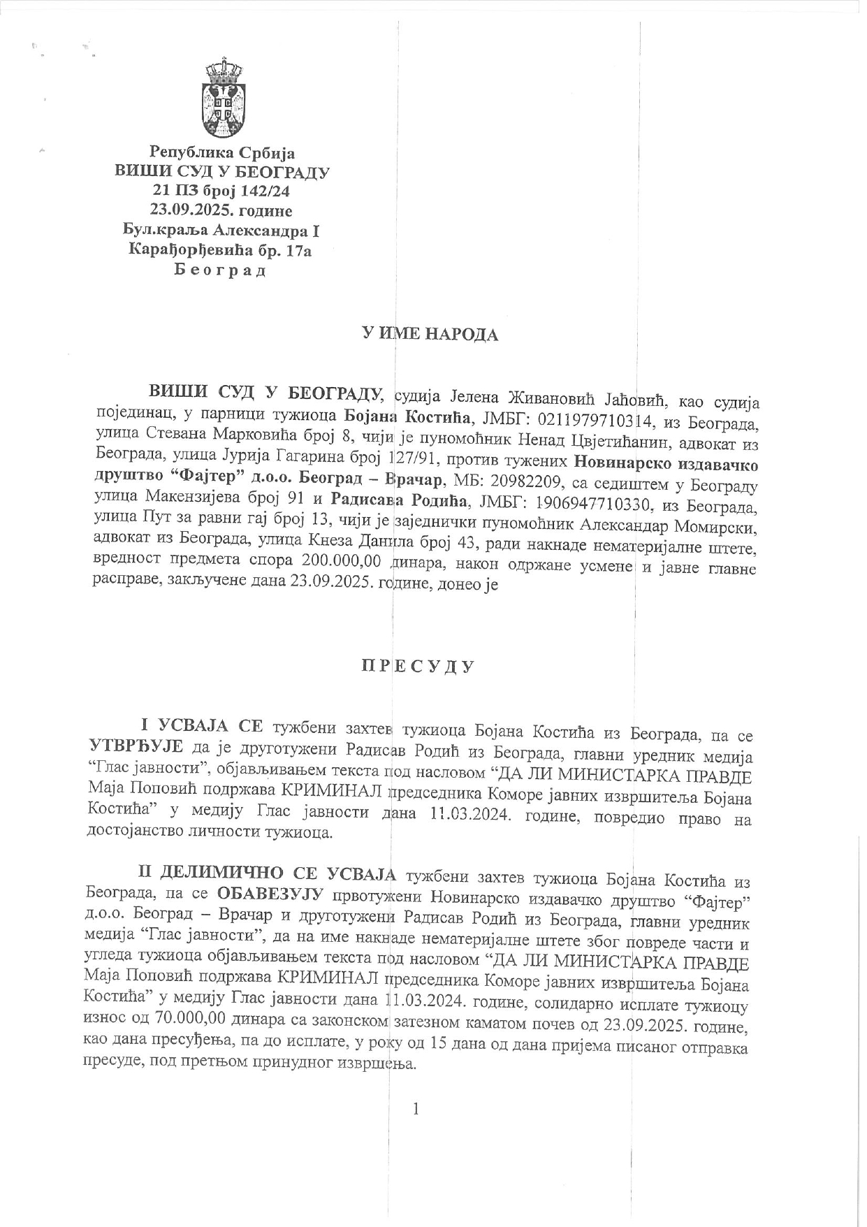 IZREKA PRESUDE: Pravosnažna i izvršna presuda Višeg suda u Beogradu P3.br. 141/24 od 23.09.2025. godine