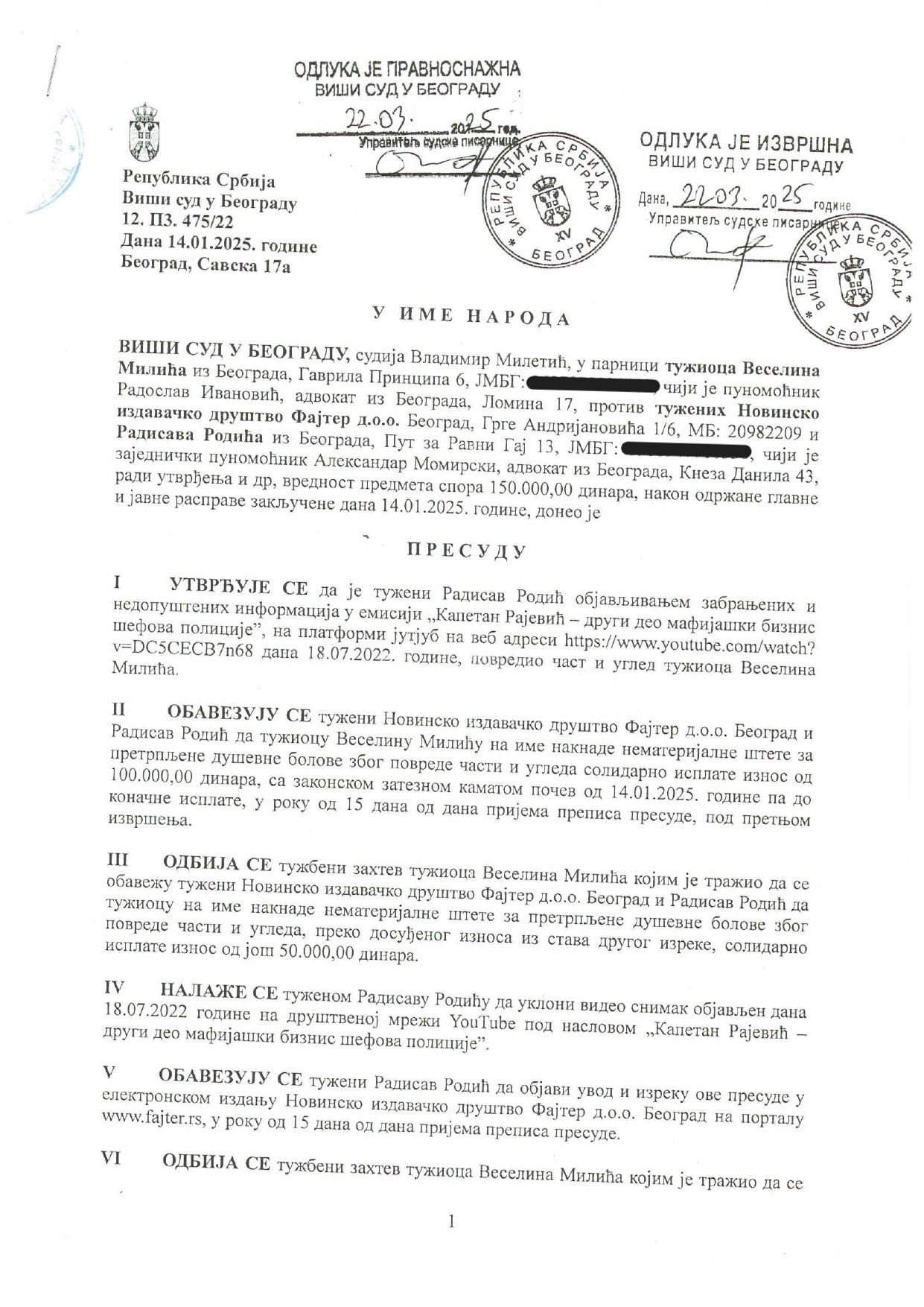 IZREKA PRESUDE: Pravosnažna i izvršna presuda Višeg suda u Beogradu P3.br.475/22 od 14.01.2025. godine